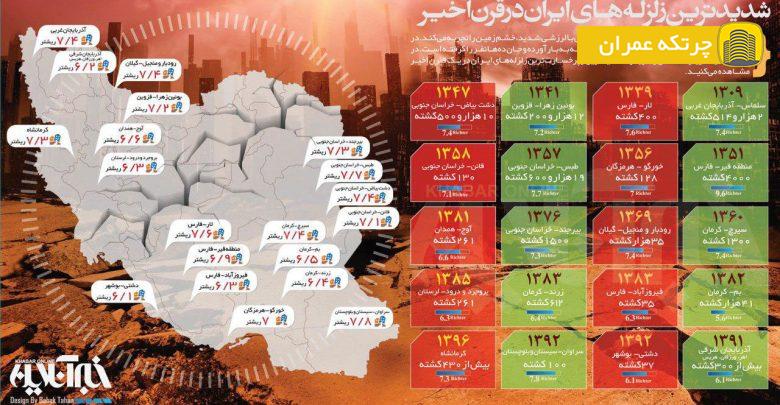 شدیدترین زلزلههای ایران در ۱۰۰سال گذشته برای دیدن اینفوگرافی در اندازه بزرگ بر روی آن کلیک کنید.